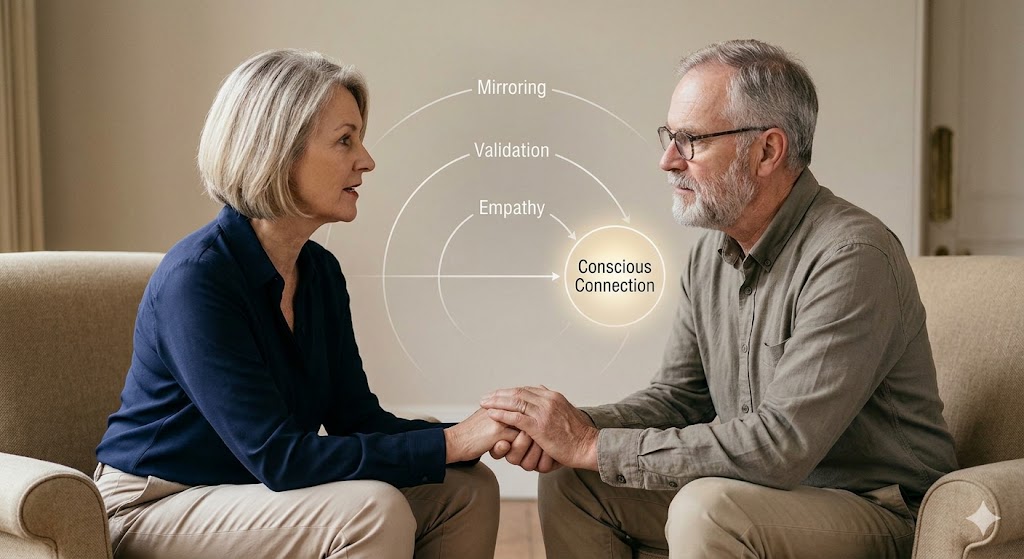 • The Sacred Dialogue: We teach you a structured way to talk—Mirroring, Validation, and Empathy—that bypasses the “Old Brain” defences. It turns a potential two-hour argument into a 10-minute bridge of connection.